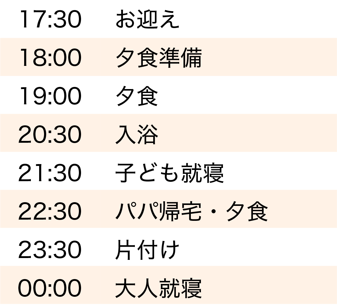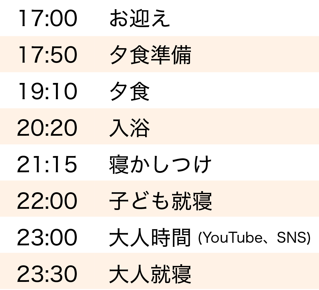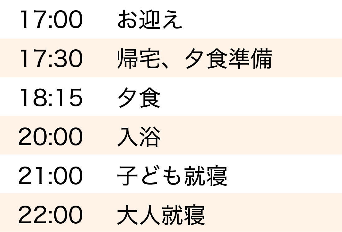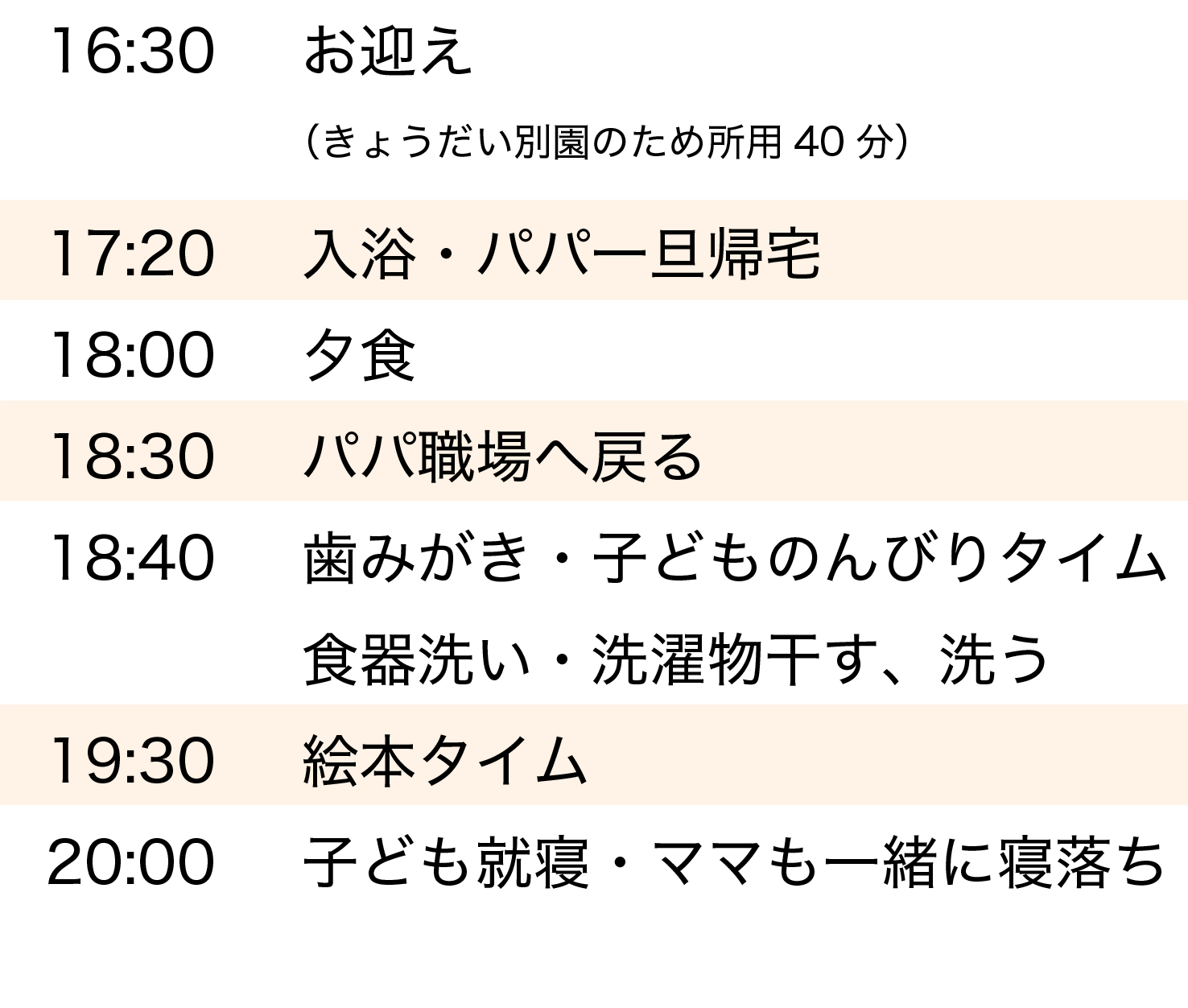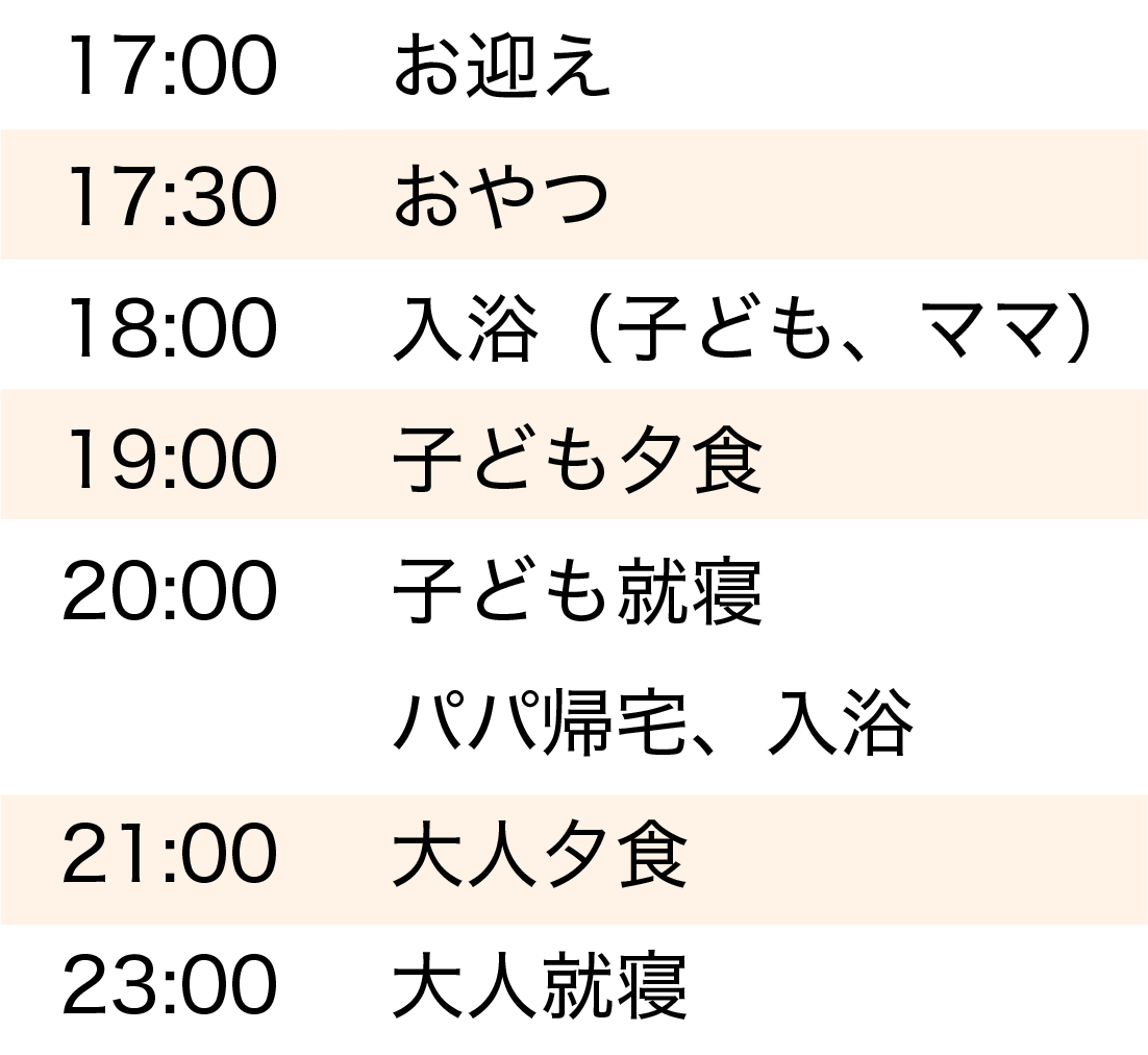 ※母がお迎えの日はこの通りで、父がお迎えの日はお迎え〜夕飯開始時間が全体的に30分くらい早く進みます。夜の対応はワンオペです。どちらが残業するのかはGoogleカレンダーを共有して、当日話し合って決めています。
