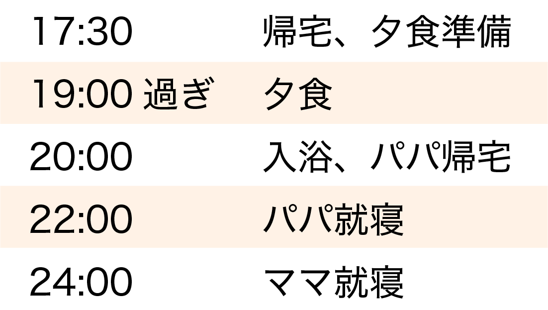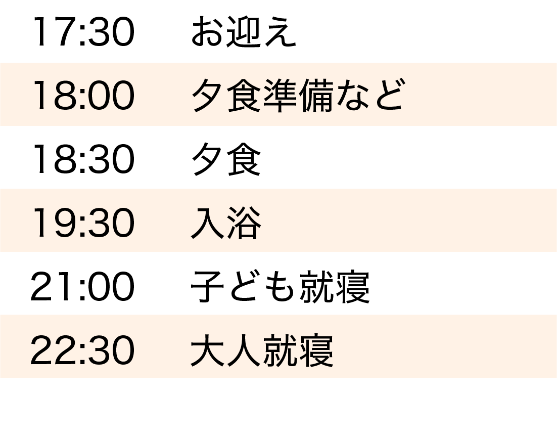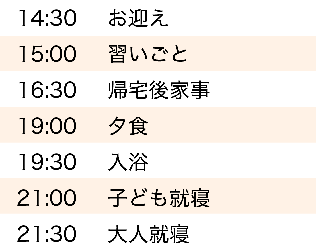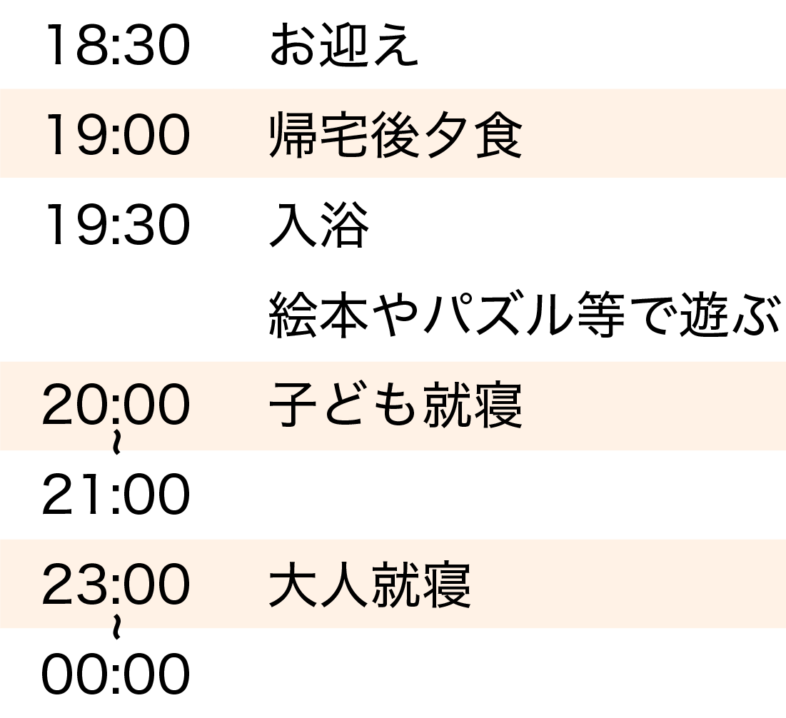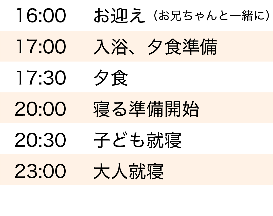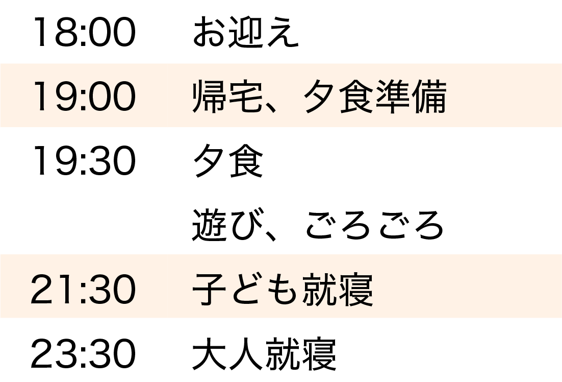 ※母がお迎えの日はこの通りで、父がお迎えの日はお迎え〜夕飯開始時間が全体的に30分くらい早く進みます。夜の対応はワンオペです。どちらが残業するのかはGoogleカレンダーを共有して、当日話し合って決めています。
