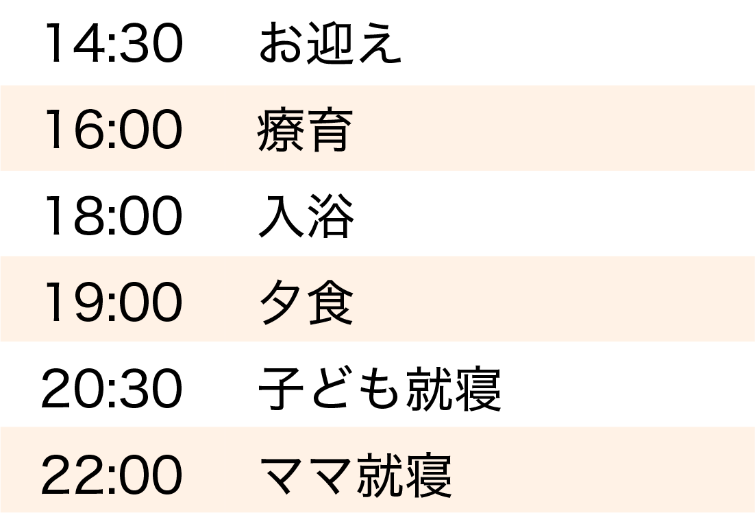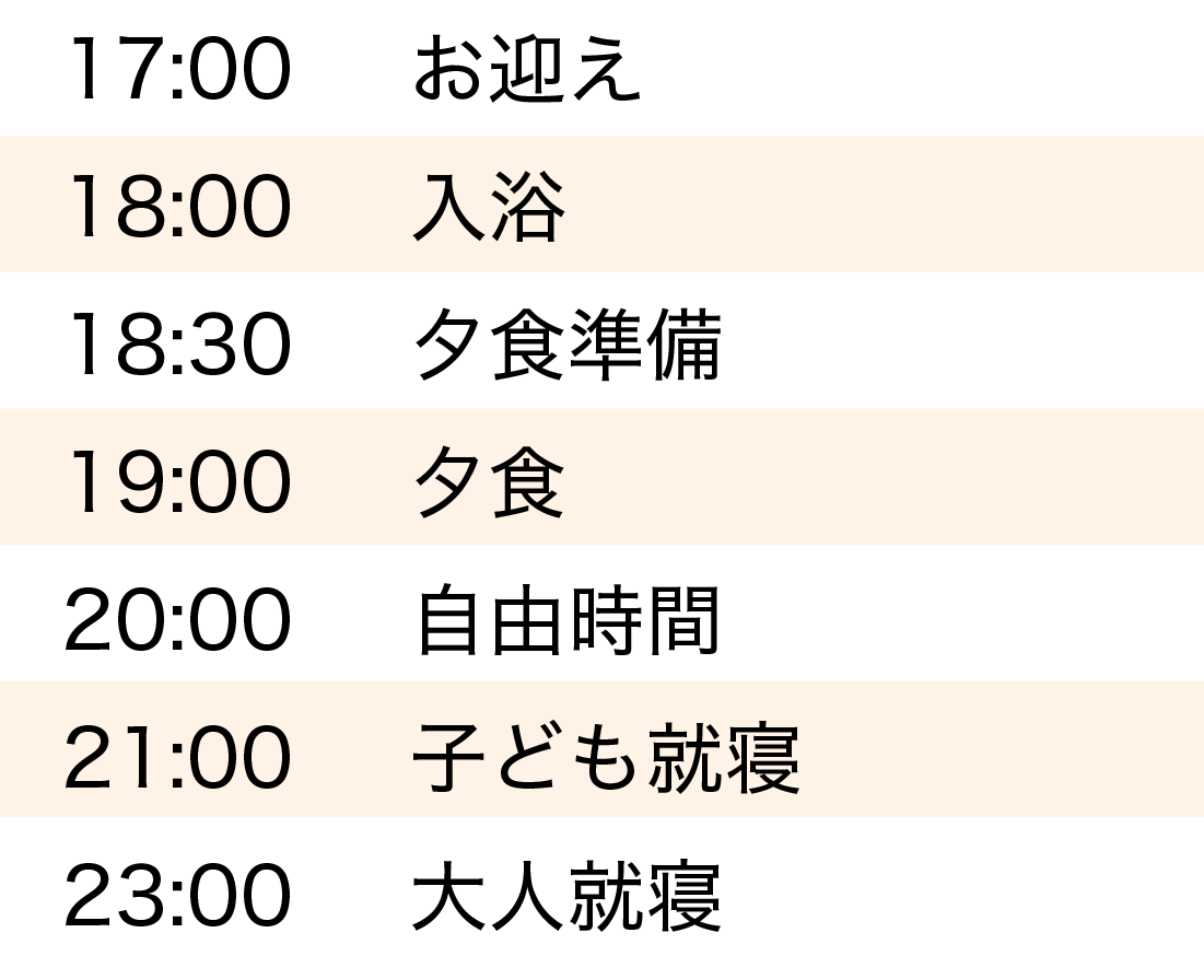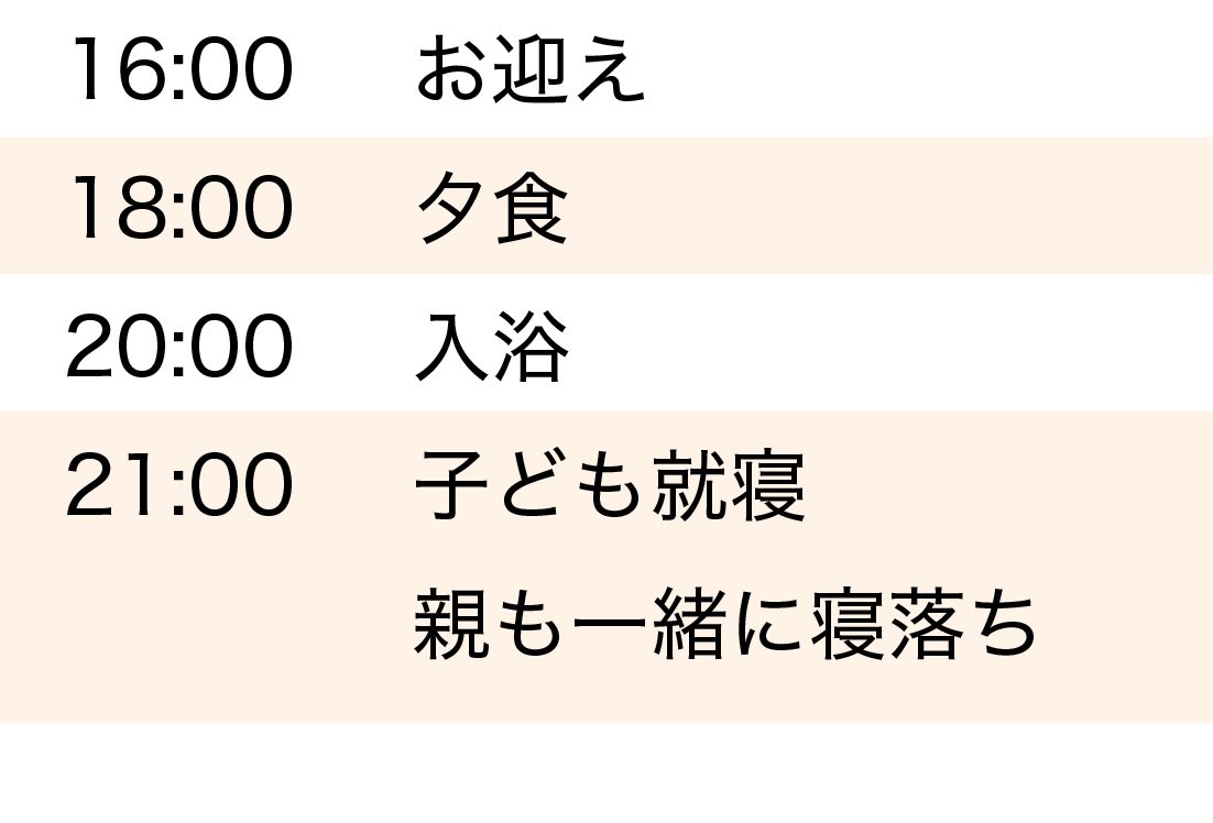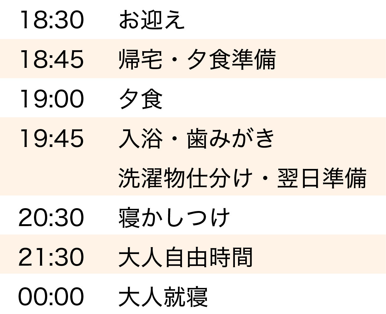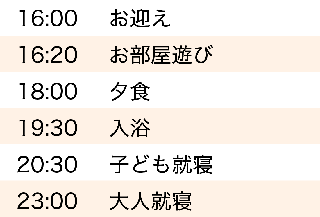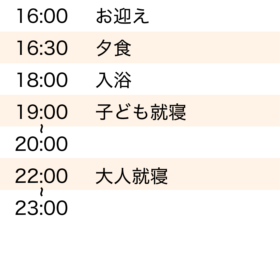 ※母がお迎えの日はこの通りで、父がお迎えの日はお迎え〜夕飯開始時間が全体的に30分くらい早く進みます。夜の対応はワンオペです。どちらが残業するのかはGoogleカレンダーを共有して、当日話し合って決めています。